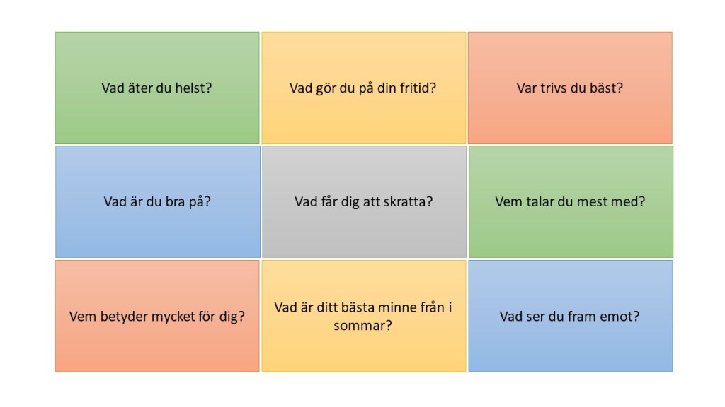 Efter ett långt sommarlov och med nya elever i klassrummen är alla typer av Ice breakers och övningar för att lära känna varandra välkomna. Ju bättre vi känner varandra i klassrummet, destu lättare är det att skapa trivsel och trygghet. De här frågekorten kan skrivas ut och lamineras, men du kan också använda mitt slumpmässiga hjul i Wordwall om du vill undvika papperslappar. Själv gillar jag alla typer av lappar för då har man något konkret att hålla i, men variation är alltid bra. Till höger i kategorin Ice breakers och samarbetsövningar finns också länkar till webbsidor med fler övningar.