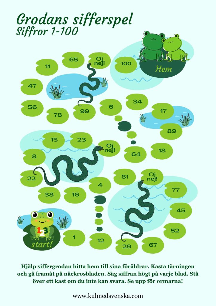 Öva siffrorna 1-100 med brädspelet Grodans sifferspel. Du behöver en tärning och spelpjäser för att spela spelet. Spelet tränar både att komma ihåg och uttala siffrorna ett till hundra, men inbjuder också till gemenskap.