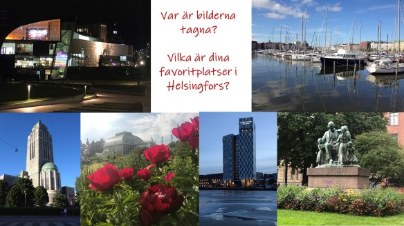 Idag var temat olika platser och vi började med några mingelfrågor som har med olika platser att göra. Sen diskuterades platser i Helsingfors utgående från de här bilderna och frågeställningarna. Alla grupper hade tillgång till karta över Helsingfors. Det blev många intressanta diskussioner och frågor kring ord och betydelser.