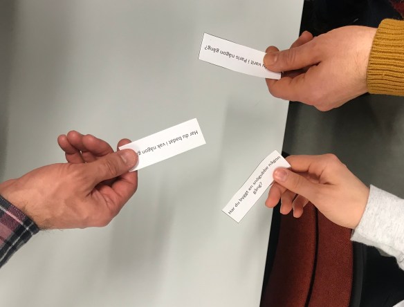 Idag jobbade vi med en rolig mingeluppgift. Alla fick en lapp med en fråga t.ex. Har du någon gång badat i vak? Man ställde sin fråga och den andra skulle svara med en hel mening. Ifall svaret blev jakande skulle man också berätta lite mer. Sen bytte man frågor och gick till nästa person. Jag gick igenom svåra ord innan vi började, t.ex. säckpipa, vak… Här kan du ladda ner lapparna.
