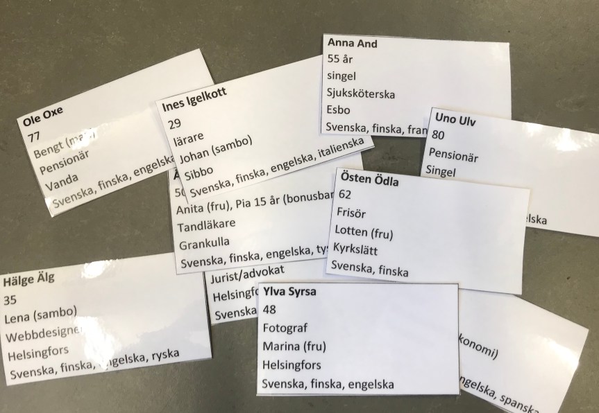 Varje studerande får en lapp och ska ställa frågor till sitt par för att ta reda på vad hen heter, var hen bor, vad hen jobbar med osv, men också svara på sitt pars frågor. När man är klar byter man lappar och går till följande person. Här övas också uttal av alla vokaler.