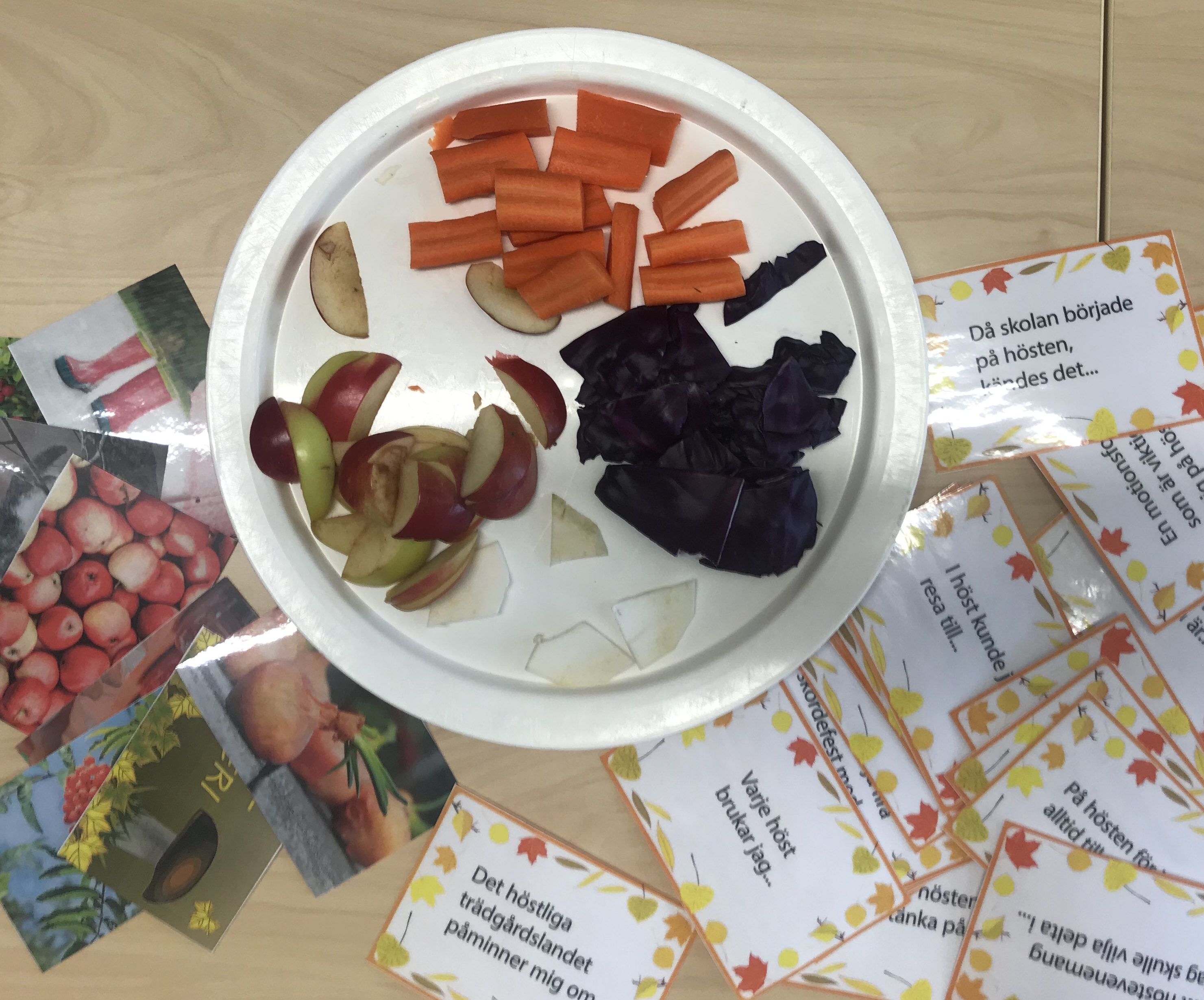 Pratkvarnens tematimme om hösten inledde vi med att smaka på morot, rödkål, rotselleri och äpple och funderade på hur hösten luktar och smakar. Sedan diskuterades vi hösten utgående från RyhmäRenkis jättefina frågekort om hösten.