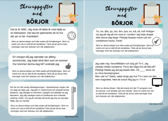 Sen får alla fundera på verb och substantiv som hör ihop med de olika årstiderna och till sist får alla skriva en kort berättelse om en årstid med hjälp av orden. En rolig uppgift är också att rita egna bilder till varje årstid eller årstidshjul och skriva korta bildtexter eller årstidssagor.