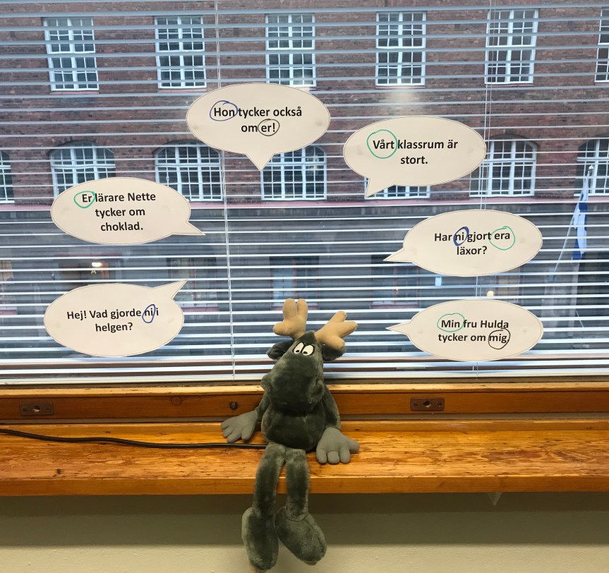 Vi har en grammatikmaskot på SFI (Svenska för invandrare). I år är det Hälge och förra året var det Herr Nilsson. Med hjälp av Hälges pratbubblor förklarar jag grammatik och övar ordföljd. Här övar vi först preteritum och sen pronomen (nivå A1.3)