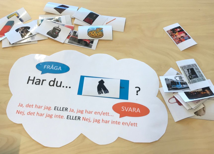 Flashkorten placeras med bilden uppåt i rutan. Studerandena jobbar parvis och ska komma på vad substantivet är på svenska. De frågar och svarar turvis. Ex. Har du några strumpor? Nej tyvärr, jag har inga strumpor.