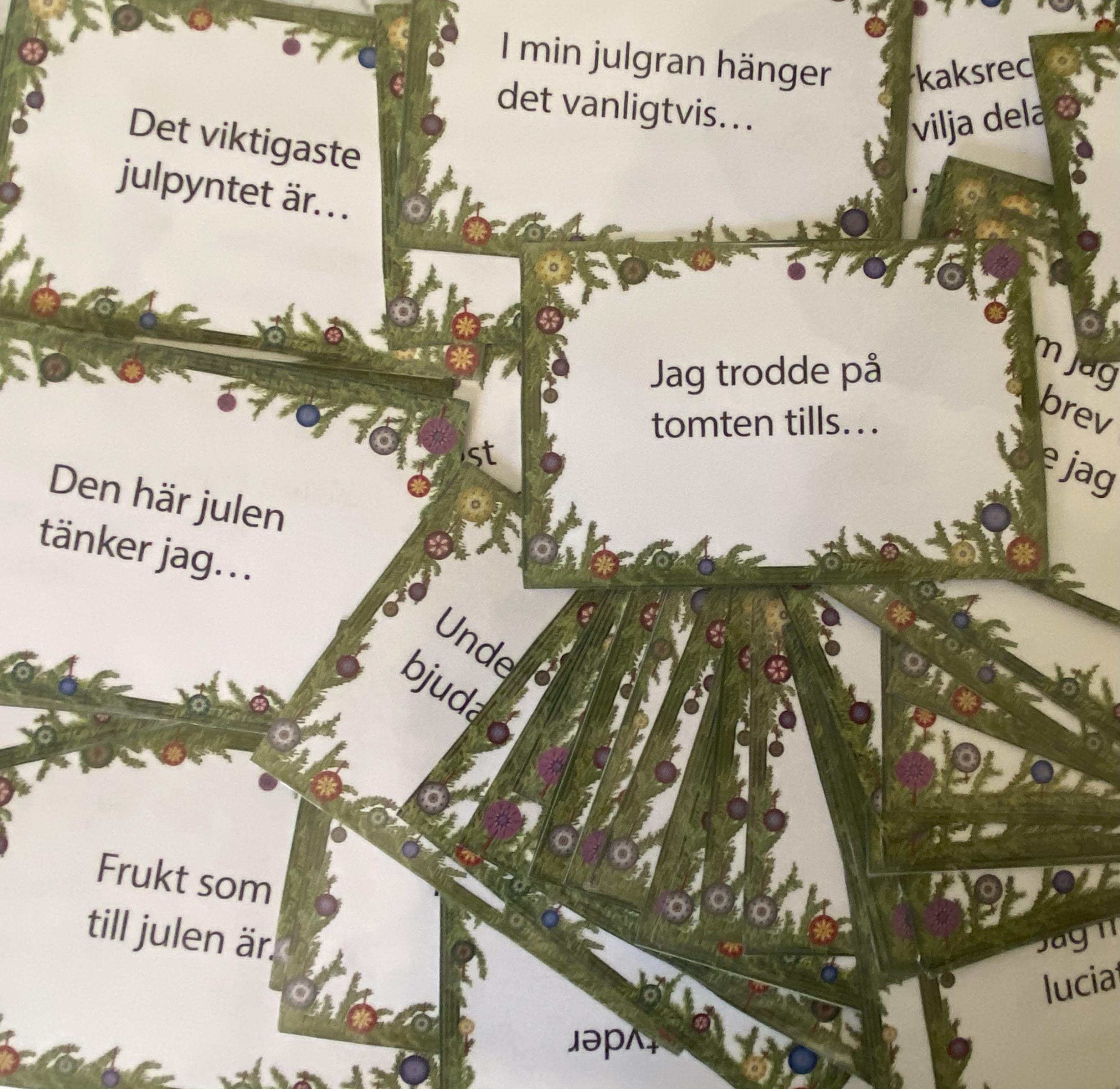 Jag har använt julfrågorna som MINGELKORT så att varje studerande får ett kort. Sedan ska alla hitta ett par och ställa sina frågor samt svara på varandras frågor. Efter det byter de kort och går till nya personer och börjar från början. På så sätt får alla tala med alla och vi rör på oss i klassrummet.