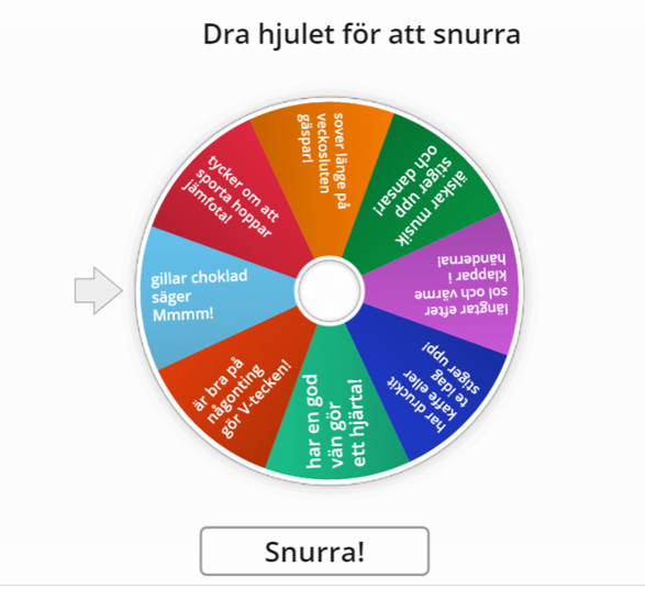 För att orka koncentrera sig i klassrummet eller på distanslektionen behövs paus- och hjärngymnastik mellan varven. Det här slumpmässiga hjulet (Alla som..) har jag gjort med verktyget Wordwall. Man snurrar hjulet och säger det som pilen pekar på. Ex. Alla som gillar choklad säger Mmmm!