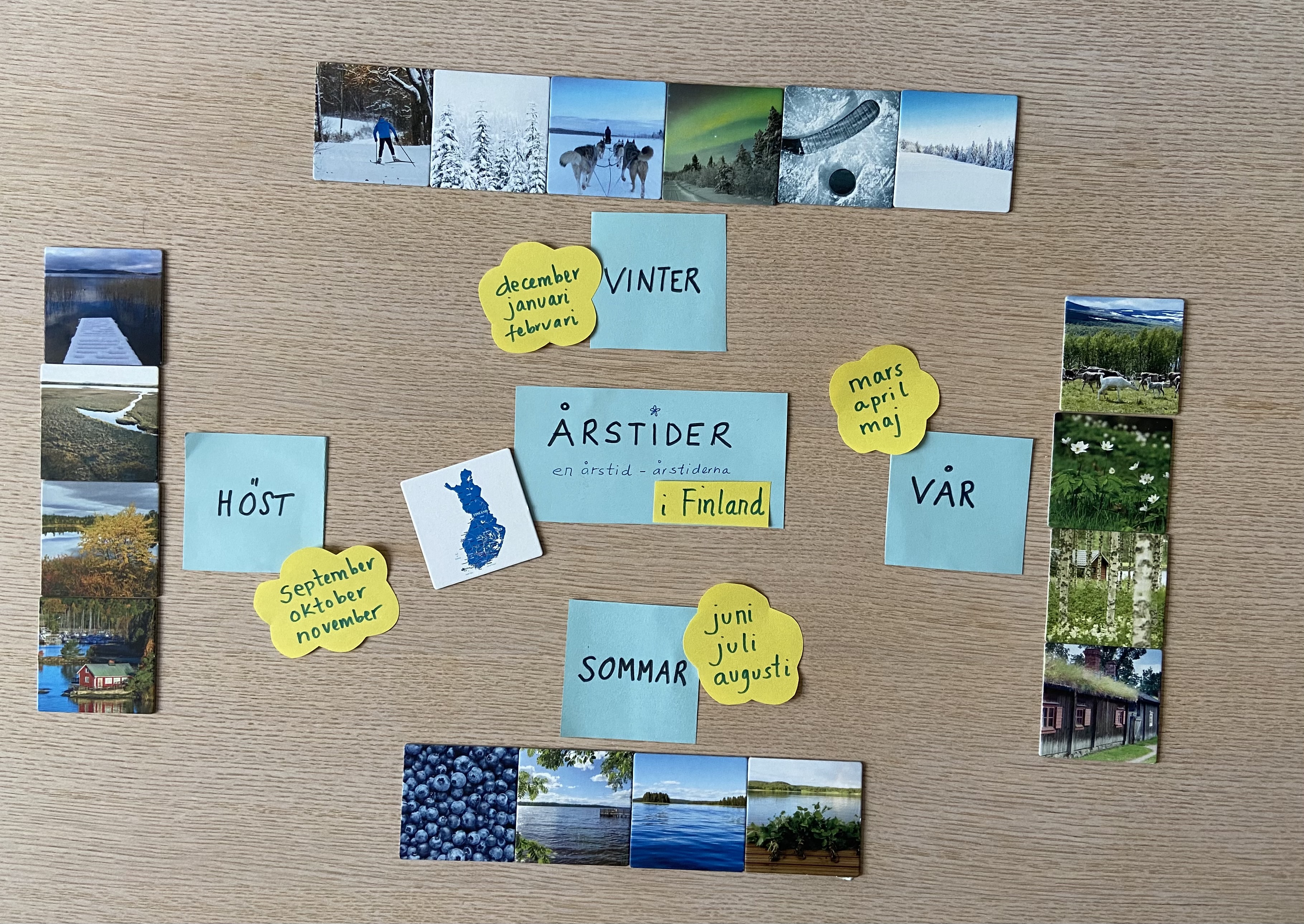 Först funderar vi på vad årstiderna heter på svenska och sedan på vilka månader som hör till vilken årstid. Därefter får studerandena placera korten vid de olika årstiderna och diskutera vad korten representerar och om det saknas bilder. Vi brukar också jämföra årstiderna i Norden med andra länder och alla får berätta vilka kort som skulle vara representativa för årstiderna i det egna hemlandet.