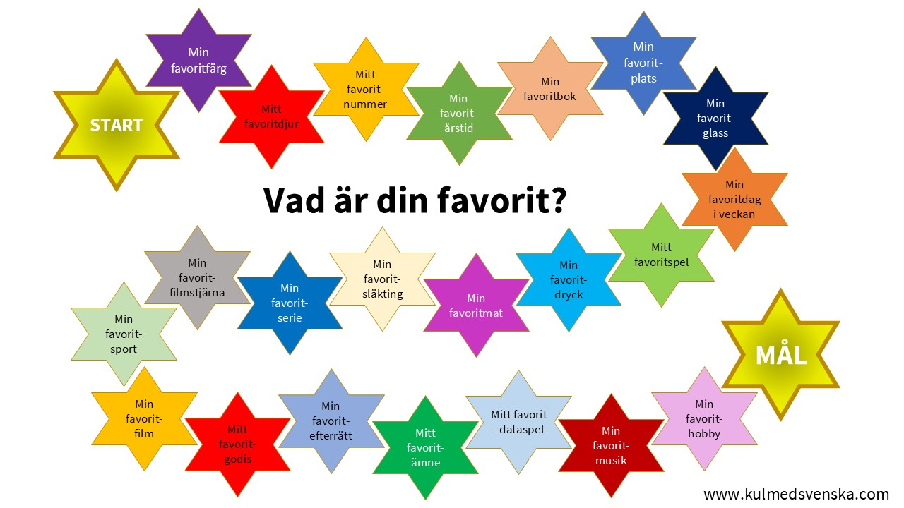 Med det här spelet lär man känna varandra bättre och övar samtidigt possessiva pronomen. Dessutom har jag uppmanat alla att också motivera sitt svar och berätta mer. Det kan spelas i grupp med spelplan, tärning och spelpjäser eller användas som mingelkort. Mingelkorten är lätta att klippa ut om man förstorar A4:an till en A3:a.